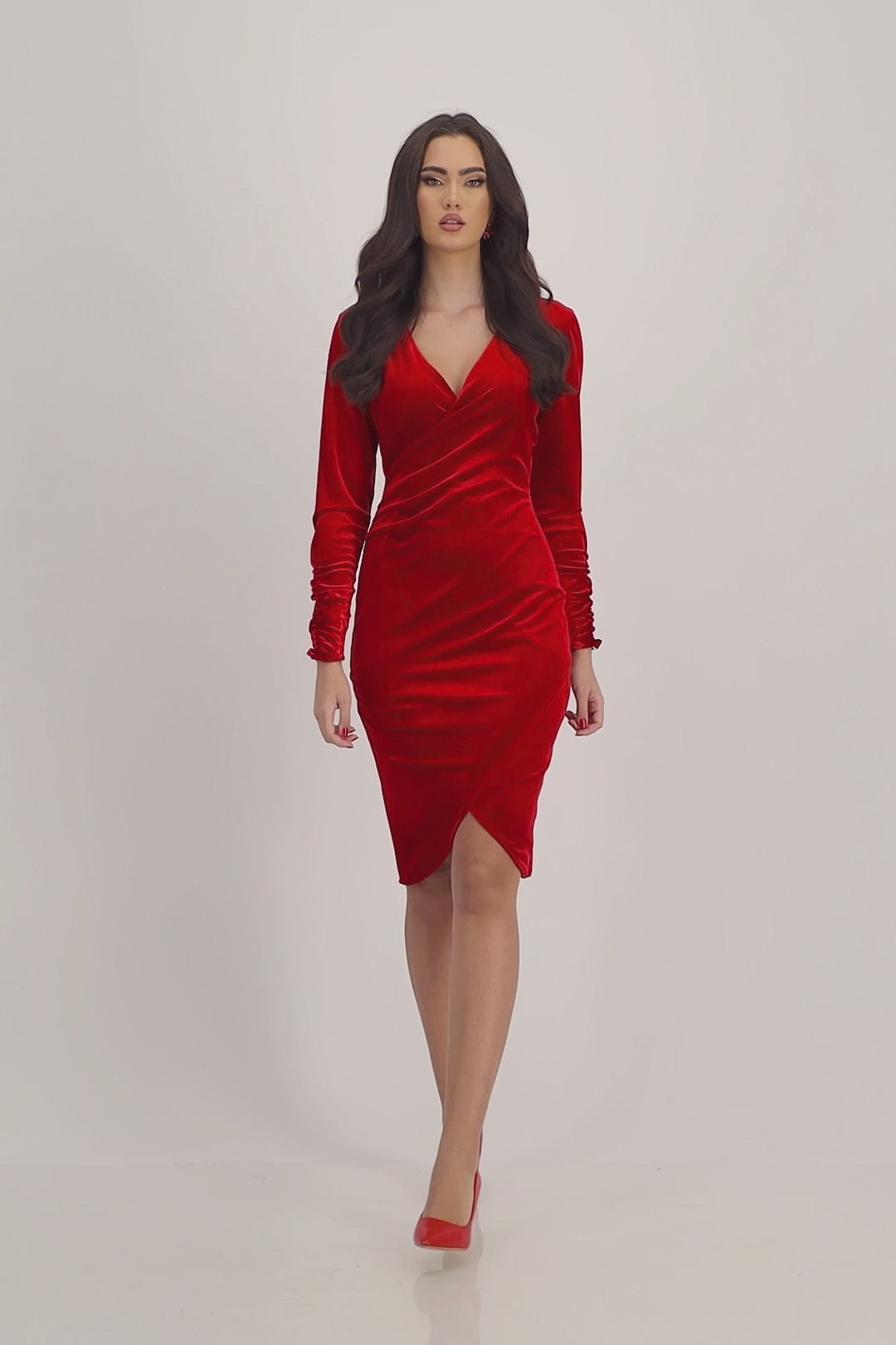 Rauður flauelsblýantskjóll með vafningslaga hálsmáli